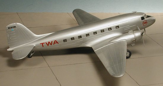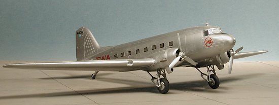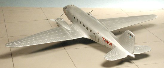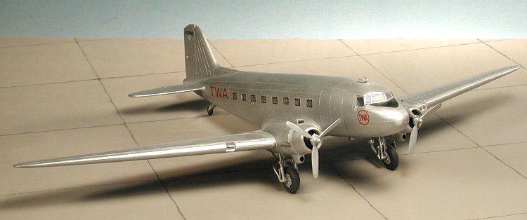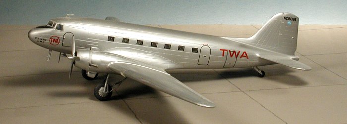 Well, color is not a problem with this kit. I wanted to do a pre-war TWA version so that means natural metal. All that was available at the time was Testors Metallizer so that is what I used. Today, I'd use Alclad II or SNJ and paint the controls surfaces with the Metallizer. Back then, it was all to be painted one color. The props were also painted aluminum as were the landing gear struts and wheels. The tires were painted a very dark grey.