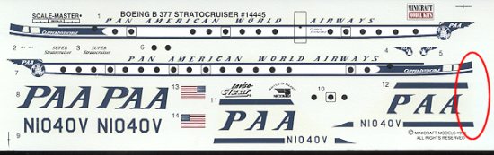 The instruction sheet is more than adequate for a kit of this type and has 6 easy construction steps. Other than the decals, color for this kit consists of aluminum, white, and black and those items that need painted are called out in the sheet. This kit is in the 'intermediate' PAA scheme with a white upper fuselage and tail. The early aircraft were in overall aluminum. The decal sheet is very well printed and fully in register, which is a big surprise for a Scalemaster sheet. However close inspection shows that it was printed in Mexico by Necomisa, which explains the clarity of the sheet. One thing I noticed on my sheet was that the clear coating on the decals was missing from the very far right part of the sheet. Look closely at yours and if you see a similar problem, you can fix it by coating it with Microscale Decal Film before using it. On the sheet below, it is the area circled in red.