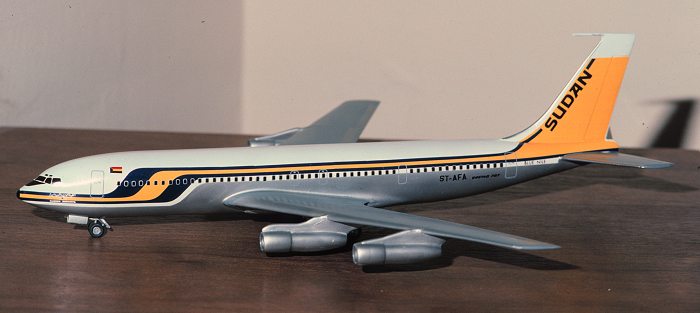 Here is the reason for being for these kits; the fancy decals. I had a great Sudan Airlines sheet that I wanted to use on this kit. It meant basically a white upper fuselage with aluminum lower and wings and stabilizers. I painted the center sections of the wings and stabilizers a dark grey (hey, I said I knew little about airliners so it is OK that I painted things the wrong color).