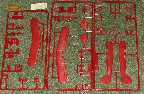 Instructions are the old type with one side showing an exploded view of the kit with painting information (in this case, red with white rudder/elevator stripes). This side is in French. On the other side are English and German construction steps. A rigging diagram is provided. The only decals are registration for the rudder and a set of stripes running diagonally on the fuselage as shown on the box art. I'm sure some hunting will come up with something more interesting. This old kit includes a rather large tube of dried up glue as was the norm back then.