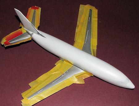 I painted the engines with Polished Aluminum so it would be different from the wing. Once the inner wing/tailplane surfaces were painted, they were masked and the fuselage was given more white to cover the overspray.