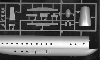 The first thing that strikes you is the size of the box. This is one huge kit! Since it is made in China, the box is quite sturdy and difficult to open. Once opened you are confronted with a sea of grey plastic. The sprues are packaged well with no more than two to a bag. Looking closer, you see several interesting things you wouldn't expect in an airliner. Gun turrets, for instance. It is obvious that, like Boeing, Academy has developed this kit from its B-50 release so the wings, engines and tailplanes are the same.