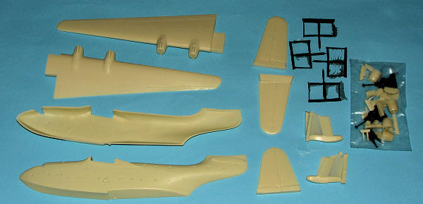 The propellers and the beaching wheels/gear are short run injected plastic. They are very nicely molded and one would think they were resin if one didn't know. Like some resin parts, they are going to need to be cut from pour stubs and have the flash removed. As mentioned, the cockpit canopy and two 'bubble' windows for the very aft are provided. All the rest of the recessed window areas will need to be filled with something appropriate, like white glue or perhaps Krystal Klear.