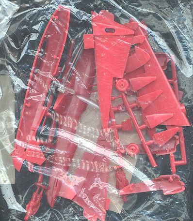 Molded in red plastic so you don't have to paint it, the kit is typical of the era with a raised panel lines, minimal cockpit (but with figures) and a display stand. It also has separate control surface so that you can position them as you would like. The parts appear crisply molded and free of flash. I didn't open the bag as this is a collector's kit, you know, and still sealed with now rusty staples! The decals for the kit are of the one aircraft G-ACSS and have yellowed rather badly in the last 30 or so years.
