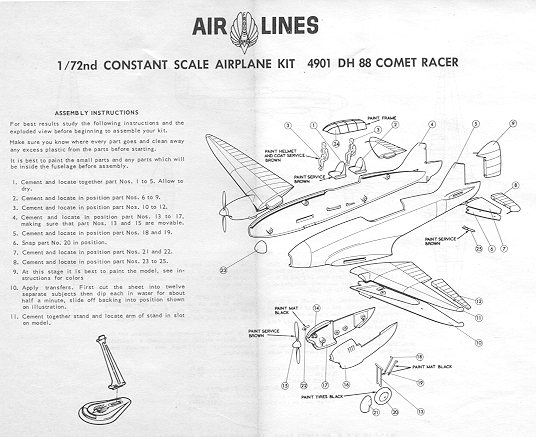 Included in the box is a generic painting folder from Testors with a number of paint schemes for various kits like the Skua and Magister (though not one for the Comet). It is rather interesting reading showing happy boys playing with their new planes. The painting instructions are all for brush painting making sure that you know how to 'flow the paint off the brush to the surface of your new kit'.
