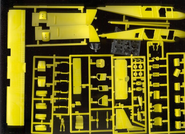Upon opening the box, one can certainly tell it is an Airfix kit. First off, it is in a lovely shade of yellow(!) plastic. Undoubtedly to alleviate the need to do any wasteful painting. Most detailing is of the raised variety with rivets. All the doors are separate so you can show off the interior. There are three different seating variations available: passenger, cargo or executive.