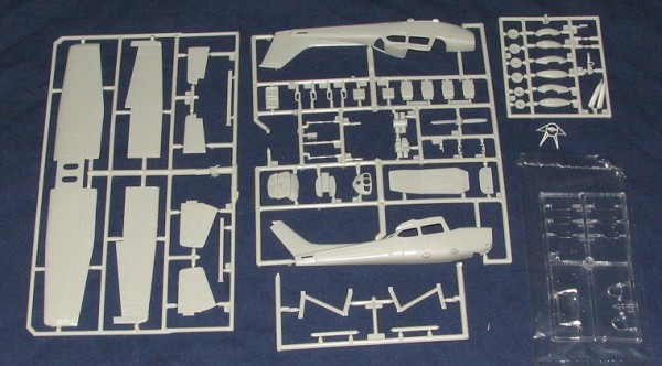 Earlier, Cessna had made a very tidy profit with their 170 series of light planes. Based on their marginally powered 150 series the 172 Skyhawk was powered by a 160 hp engine with larger power ratings available. It could carry four passengers and 120 lbs of baggage. Not only that, but it was easy to fly and handled quite well. The 172 Hawk XP, the basis of this kit, was introduced in 1977 with a 195 hp engine. It also had several other amenities and was available with floats should the owner wish. Built in France as the Reims Rocket, a total of over 30,000 172s have so far been built.