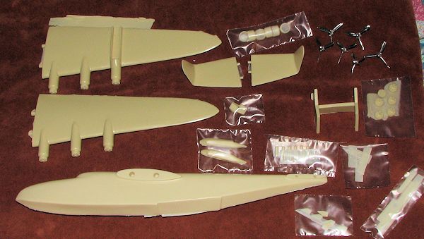 There are cast metal props and spinners. The casting is fairly well done, but on each prop assembly, one blade appears to have suffered from major mold shift. All the props were slightly bent from banging around during shipping. Speaking of which, when I got this kit, the fuselage was firmly wrapped in foam wrap while the wings and tail pieces were loose in the box. All the resin bits were in their separate bags according to the piece and these were all in another bag. The metal props were also in their own bag. Nothing appears to have broken, though there was a lot of large flash detritus in the bottom of the box.
