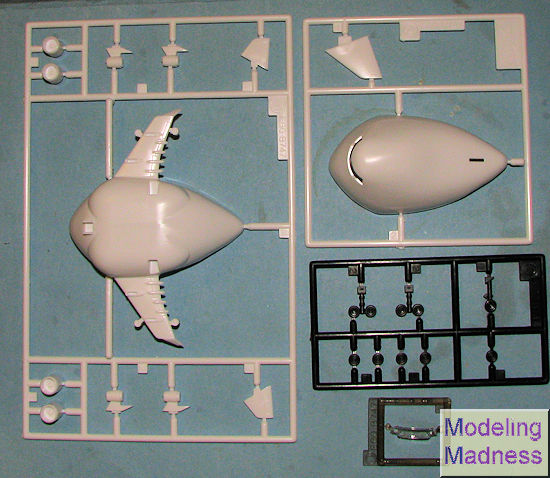 If you are looking for accuracy, look elsewhere as you won't find it here. The aircraft consists of a lower fuselage half that incorporates the wings. The upper section has a slot for the fin and an opening for the windscreen. Each of the four engines is in two pieces with the front fan section attaching to the aft hot section that also includes the pylon. These fit into large slots in the lower wing. Horizontal stabs fit in once the fuselage sections are joined. No weight is shown as needed and previous experience with these kits shows none is needed. The landing gear have wheels on one side molded along with the gear with separate wheels to be attached on the other side. These bits are in black plastic, apparently to help with painting. The nose gear doors are molded in place and there really are not any main gear doors, not that anyone really minds.