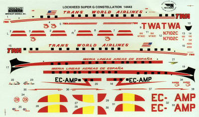 The instructions are well done and show you any important paint requirements. Nothing fancy, but more than adequate to build the kit. All the paint information gives FS numbers where they are required. You have two decal options. One for the box art plane from TWA and the other is for Iberia Airlines. The decals are nicely printed by Necomisa of Mexico. Personally, I'd test these with a small marking not being used and if necessary, recoat the decals. Both planes are white over natural metal with FS 16515 light grey wing walk areas. The black trim line for these will have to come from the spares box.
