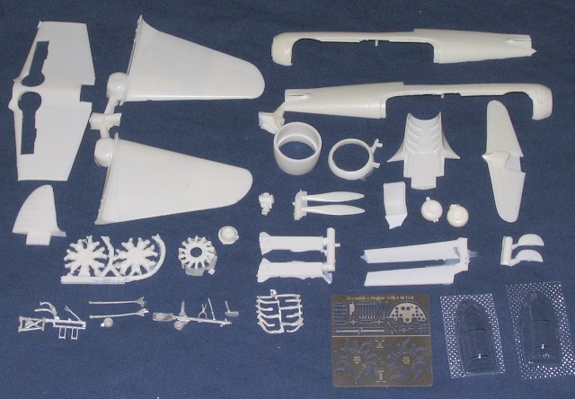 Overall the molding is pretty good. The detail level is quite nice, though it is a bit on the soft side when compared to a high pressure injection molded kit. When I and other reviewers talk about soft molding, we mean that the edges are not crisp 90 degree angles, but are somewhat rounded. This is a very common thing among most short run resin kits. I did find a few air bubbles on the edges of the stab and cowling, but nothing major. Parts with quite a bit of flash and mold junk were the engine and the exhaust. These will require considerable clean up. The engine sections have some resin build-up atop the cylinders in a few cases, but a few minutes with a motor tool will take care of these areas. In addition to the few air bubbles, there is a tad bit of pitting on the large parts, such as the wing.