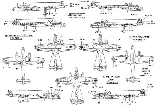 The first aircaft is a Do-17E-1 of III/KG 255. This is an aircraft that partook in war games so it's national markings were overpainted with red circles (and you thought it was for a Japanese Dornier!!) This one also has a red tail band with the swastika in a white circle.
