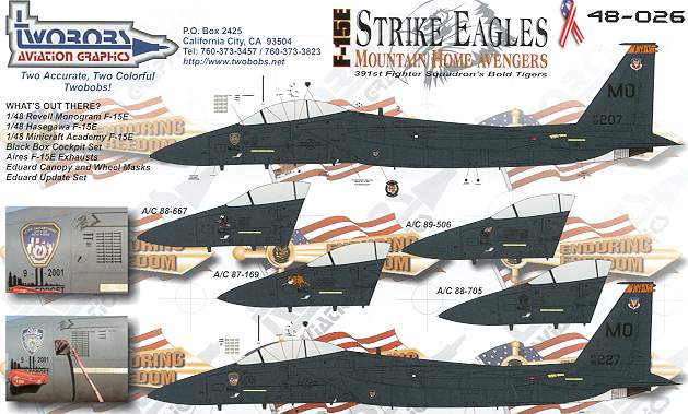 This sheet offers the option of six aircraft, all from the 391st squadron 'Bold Tigers'. Each of these aircraft was given patriotic nose art emblazoned in part with '9-11-2001, Never Forget'. There were also mission markings applied to each of these aircraft.
