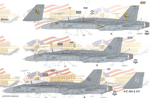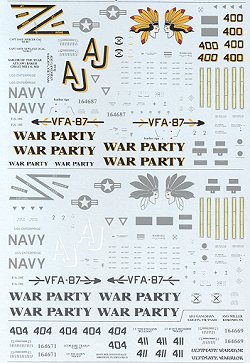 The three planes on this sheet are all from VFA-87, as TwoBobs invariably does all the aircraft on a sheet from the same unit. In this case, you get the CAG bird and two other 'normal' aircraft of which there is enough 'stuff' to do two planes if you scrounge the lerex-walk markings from another source. That lerex walk area is on an addendum sheet not shown.