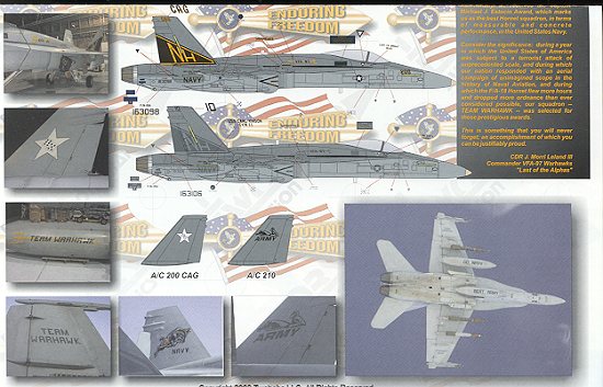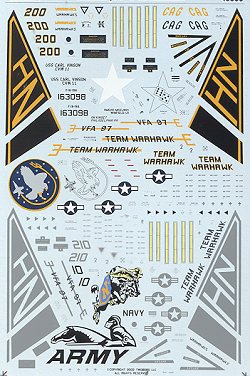 The main theme of this particular sheet is a special paint scheme for the Army/Navy football game that takes place each year. It has become a tradition for one unit to decorate an aircraft for this game. This sheet portrays this aircraft as well as the CAG bird from VFA-97.