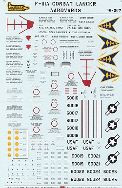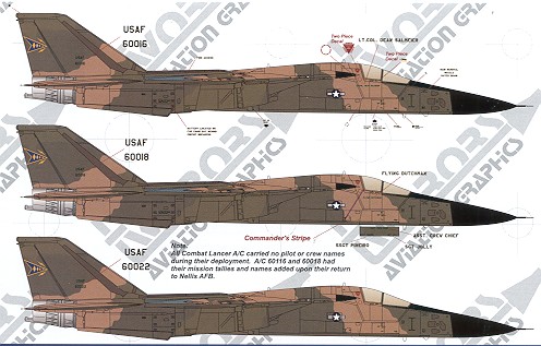 This sheet covers all of the aircraft that were assigned to the Combat Lancer program. If you look at the sheet, you'll realize that there really was little in the way of special markings for these aircraft, so you may well want to consider this to be an F-111A data sheet with the Combat Lancer markings tossed in!