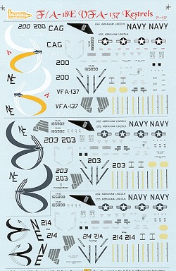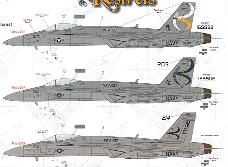 The sheet includes stencils, insignia and slime lights for all three options. You may note that these latter items also have IR lights for use when flying with night vision goggles. TYpical of Two Bobs, there are small photos of the actual aircraft included on the sheet. For kits you have the Revell/Italeri version, which is a preproduction aircraft, or the later Hasegawa F-18E, which is to full production standards. Either way, you'll have a nice model of one of the latest additions to the fleet.