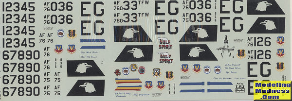 This set has markings for the 33rd TFW at Eglin AFB which got its first Eagle in 1979. They all have the eagle motif on the inside of the vertical stabilizers along with fin stripes on the outside to depict the squadron. In this case, you have the blue for the 58th TFS and the multicolored band for the wing commander's plane.