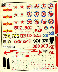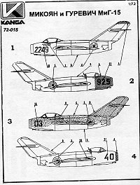 A company that few have heard of, Kanga produces(ed) sheets that are aimed at Russian aircraft, and from what I've seen of the few sheets I have, KP kits in particular. This one is for the MiG-15 and while no kit is specified, when this originally came out, you had little choice.