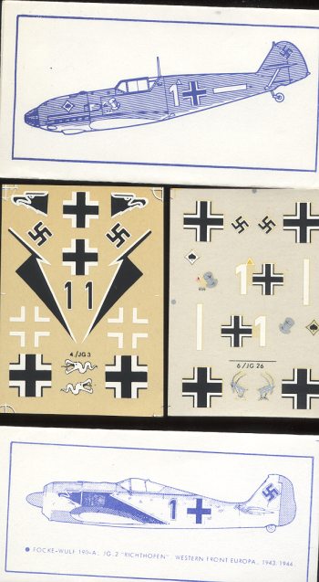 #106 is for a JG 2 Fw-190A (no variant was given as most people didn't know or care, but I suspect it to be an A-3 or even earlier). As a bonus, an extra set of unit markings was added to the sheet. Inside the small folded sheet was a color and markings diagram showing the various colors to be used. This one called for RLM 74/75/76 with a red rudder and under-cowling marking. It even gave a reference. We now know that the red markings were probably yellow as historical research into these units is much more advanced than it was 30 plus years ago.