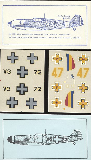 The first scheme is a Bf-109E of the Rumanian AF. The subtype isn't given, but I suspect it to be a Bf-109E-4 or E-7 as that was commonly exported.