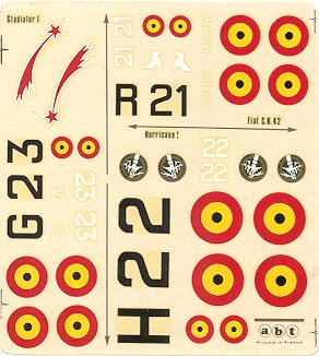 The decals offer a compete set of markings for the aircraft chosen. I would think they they were designed for the old Airfix Gladiator and Hurricane as well as the Revell CR.42. If using the sheet today, you have much better kits available. Hasegawa for the Hurricane, Misterkit for the CR.42, and Heller for the Gladiator.
