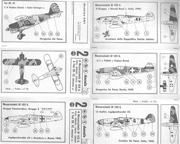 The only non-109 on the sheet is a Hungarian CR.42 in early war markings of the the red, white and green chevrons. This is the marking currently used by Hungarian AF aircraft.