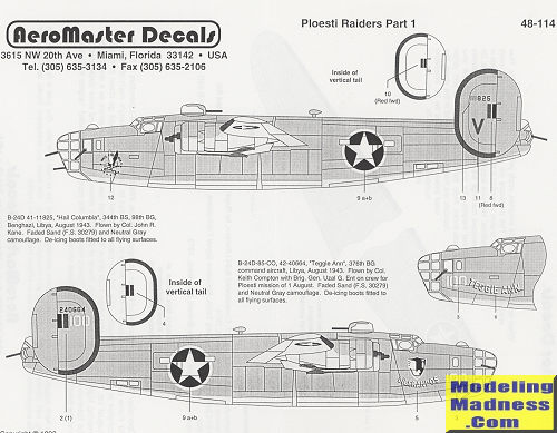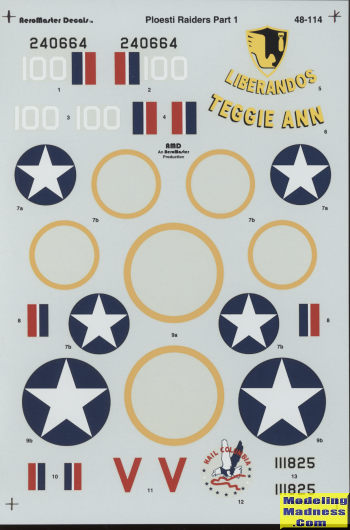 This sheet is the first of several done by Aeromaster based on the aircraft that participated. They are all B-24Ds and painted in sand over neutral grey. Both of the subjects have de-icing boots on the flying surfaces. Still the only kit of this plane in 1/48 scale is the Monogram offering.