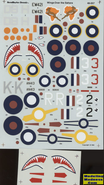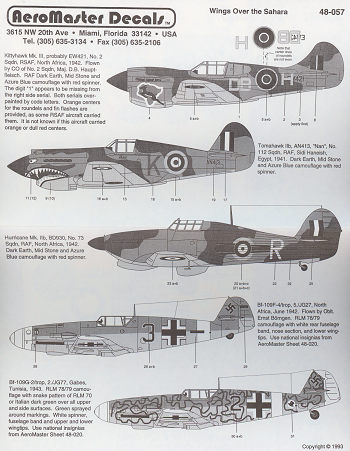 This particular sheet provides markings for five aircraft that flew the skies of North Africa. Both the Commonwealth and German planes are in the standard desert camo schemes for their sides.