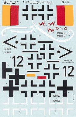 Face it, Luftwaffe sells and since I like the subject, I'm pleased to see new sheets! Again, the super new Hasegawa kit is the recommended choice though these markings will fit the older kit with some trimming. All of these have the 'blown' canopy and standard tail sections.