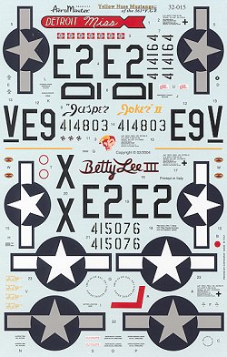 The sheet includes the low viz insignia for 'Detriot Miss' and regular insignia for one other. There are enough common data markings for one plane and all the various bands and stripes will have to be painted.