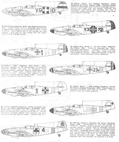 White 1 is Slovak AF G-6. Slovakia was a puppet state of the Germans so was offered some sovereignty during the war, though all its military was subservient to the Luftwaffe or Wehrmact. Yellow fuselage band and lower wing tips.