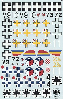 Well, folks, this is the sheet that started it all for Aeromaster in 1992. Not surprisingly, they decided to play a safe bet and do a multi-national Bf-109G sheet. As we all know, Luftwaffe sells and 109s sell more than any other type. Not surprisingly, the 109 was exported to a large number of Axis nations and puppet states. This sheet has a lot of them. Now I won't vouch for all the markings. As you know, Aeromaster was called Errormaster because of the number of glitches in its early sheets and this one has one or two as well. We all learn by our mistakes and we even find out that what we thought was right was wrong.