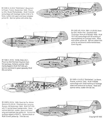 From 9./JG 2 comes this E-4. Instead of yellow it carries a white nose. It was based in France during the summer of 1940.