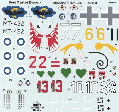 Oh boy! Another Bf-109 decal sheet. This one is probably one of the first done by Aeromaster. Looking at it today, one can see that none of the markings are particularly original; some of them having been copped from various Microscale/Superscale sheets., and at least one from the now rather inaccurate William Green Book of 1971, "Augsburg Eagle", from which the sheet name was taken. I wouldn't be surprised if many of them are on later Aeromaster sheets as well!