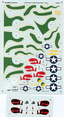 The first aircraft is 'HaleakelaII' from the 459 FS/80 FG, the only P-38 unit in India during 1944. This garish aircraft has a green dragon motif on both engine booms. The green markings are provided separate from the yellow outlines. The engine fronts will have to be painted to match the decal. Aeromaster has provided templates in case you want to paint all of the green markings.