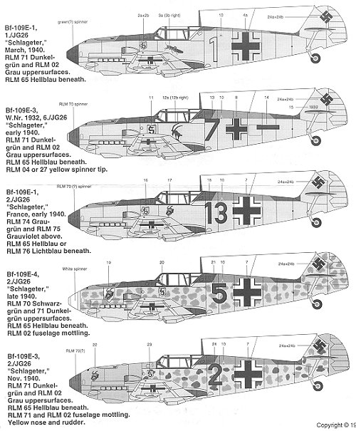 First is a Bf-109E-1 from 1./JG 26 in March 1940. It is is in RLM 71/02 over RLM 65