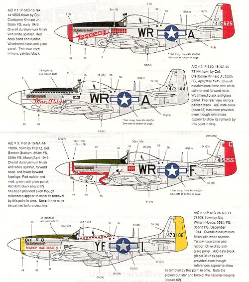 It seems that modelers just can't get enough P-51 sheets. To help fill that need, here is another sheet of 8th Air Force Mustangs. Most of these are late war P-51D versions with one earlier P-51B (not shown) tossed in. All of the D models are in overall natural metal with painted aluminum wings. The B model is in OD over Neutral grey with white wing and tail bands.