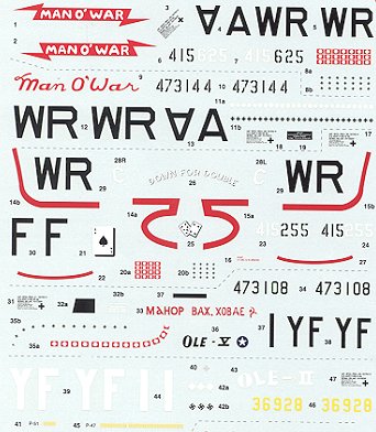 Next is 'Down for Double' , also from the end of the war and the 354 FS/ 355 FG. You must paint all that white under the nose prior to applying the decal. From the 358 FS comes 'Ole-V' with a yellow tail and nose band and white spinner. This plane has subdued markings and the only insignia offered in the sheet. All other insignia will have to come from the kit or an alternate source.