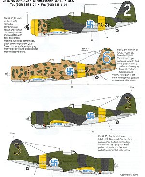Blue 6 is in standard Italian colors, but with the yellow wing tips and fuselage band carried by Finnish planes.