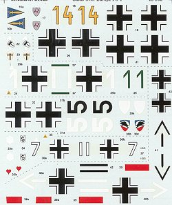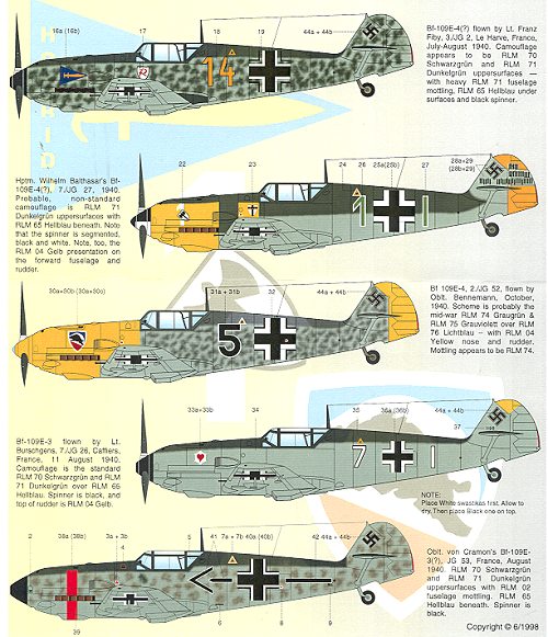 This particular sheet is for early war 109Es. Most of them are in the RLM 70/71 over RLM 65 scheme with differing degrees of mottling on the fuselage sides. Available kits are not difficult to find as there are E-3/E-4 kits available from Tamiya, Hasegawa and Hobbycraft that are quite acceptable.