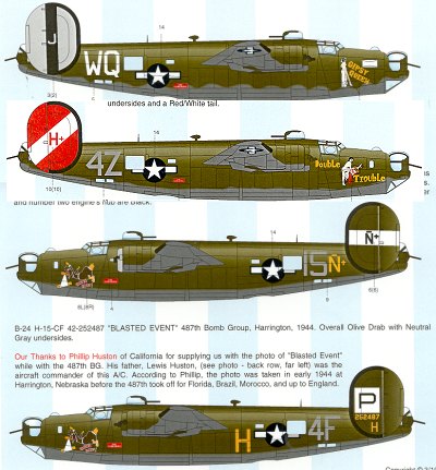 The double plane is 'Blasted Event'. Markings are provided for both the 445th BG (upper) and the 487th BG (lower). The 487th BG was the first group to own the plane.