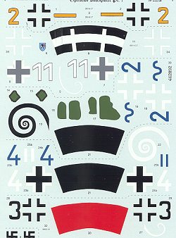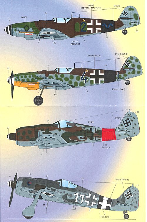All of them are interesting schemes and will be fun to paint. I'd recommend Tamiya for the FW-190s and Hasegawa for the Bf-109G-14s though there are other kits that can be used. There is also a second partial sheet with more insignia and data decals.