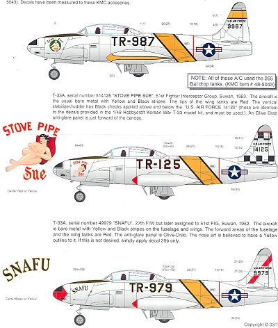 This is the second of Aeromaster's Korean War T-33 sheets. These planes were not used in combat (at least, I don't think so) and while armed with two .50 cal machine guns, I think those were mostly just to make the pilots feel good about themselves. Mostly they were used for pilot hacks and to let the desk pilots get their required hours per month for flight pay.
