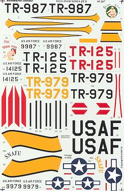 When it comes to kits, you have two actual choices. One is the Hawk/Testors kit of rather ancient fame. The other is the newer Hobbycraft/Academy version. You need to note that these planes all used the smaller 265 gallon tanks that were slung from under the wing tips and not attached to the outer part as was more common in later years. I don't know if these come with either of the kits, but a reference to a set by the now defunct KMC is given. This sheet was printed in 1997.