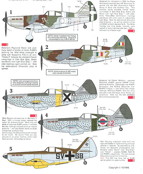 FInally, one of the new built fighter trainer D.520s. This one is in a rather interesting scheme as the only info available is 'brown over light blue over yellow'. You can interpret that any way you wish. Aeromaster states RLM 81 over RLM 76 over RLM 04. It also states that the upper wings may have been in a splinter camo, but no proof of this was available in 1996 when the sheet was produced. Any additional info?