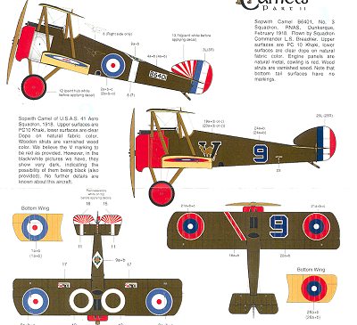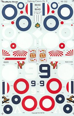 WWI aircraft get darn little attention from the decal folks and Allied planes fare even worse than the Germans. This particular sheet is for two rather colorful Sopwith Camels. Few people realize that the USAS flew the Camel, but several squadrons were operating the type by the time that war ended in November of 1918. The Camel was a particularly difficult plane to fly and more Camel pilots were killed in training and other non-combat accidents than were killed by the enemy.