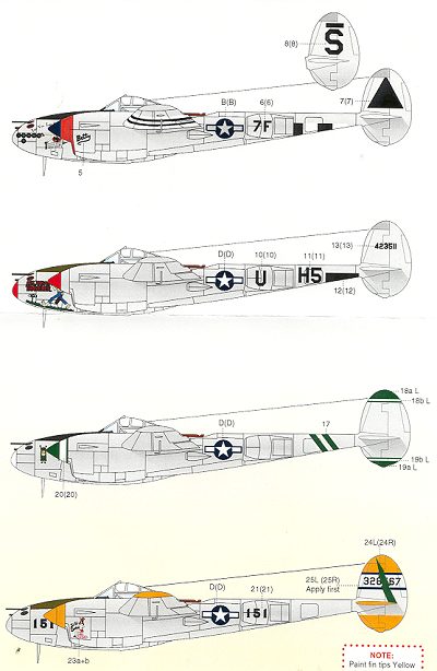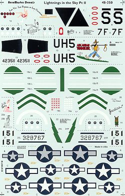 This particular sheet has four bare metal Lightings on it. I'm not a big P-38 fan so most of the units are rather unknown to me.