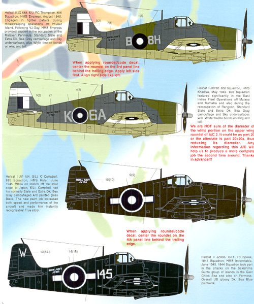 This sheet covers for Hellcats. The Hellcat I is the equivalent of the F6F-3 and the Hellcat II is the F6F-5. In all respects, they were the same as US planes, at least from the outside.