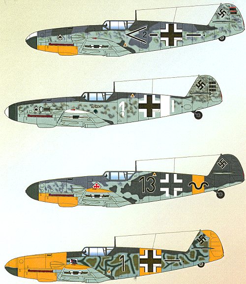 This JG 53 G-4/trop was flown by the staffel kapitan Jurgen Harder. It carries Mediterranean theater markings of white wing tips and fuselage band.
